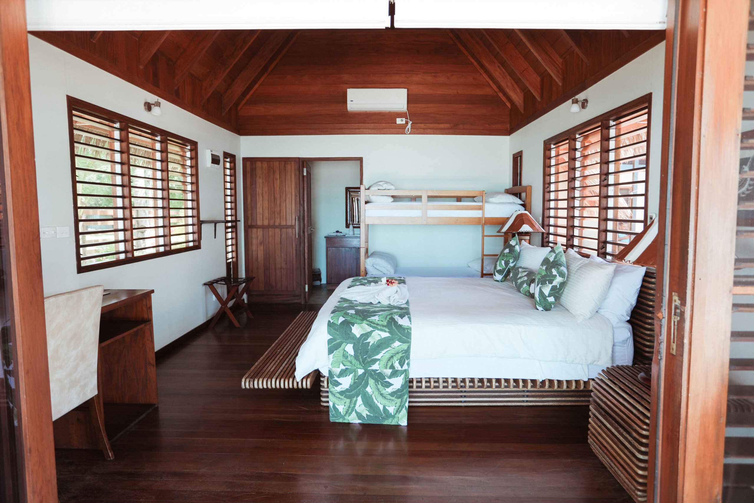 Inside, the room features a luxurious super king bed along with additional bunk beds—ideal for couples, friends, or small families. Louvered windows invite cooling sea breezes, while air conditioning and a ceiling fan ensure comfort at any time of year.