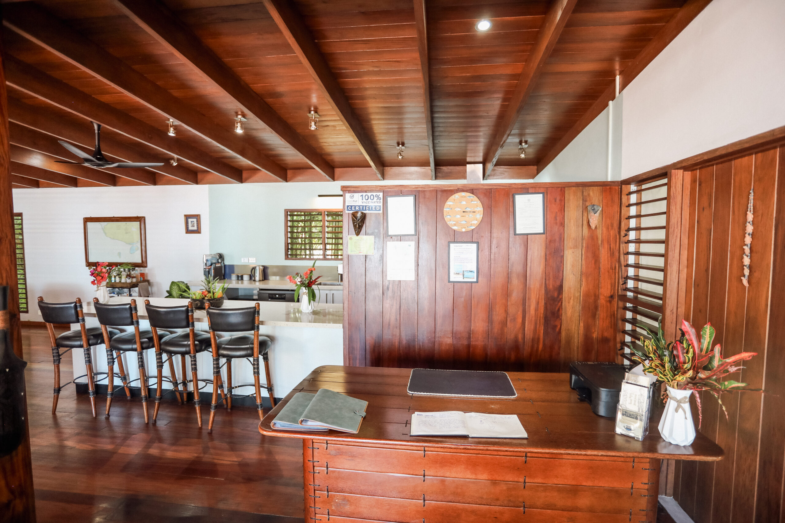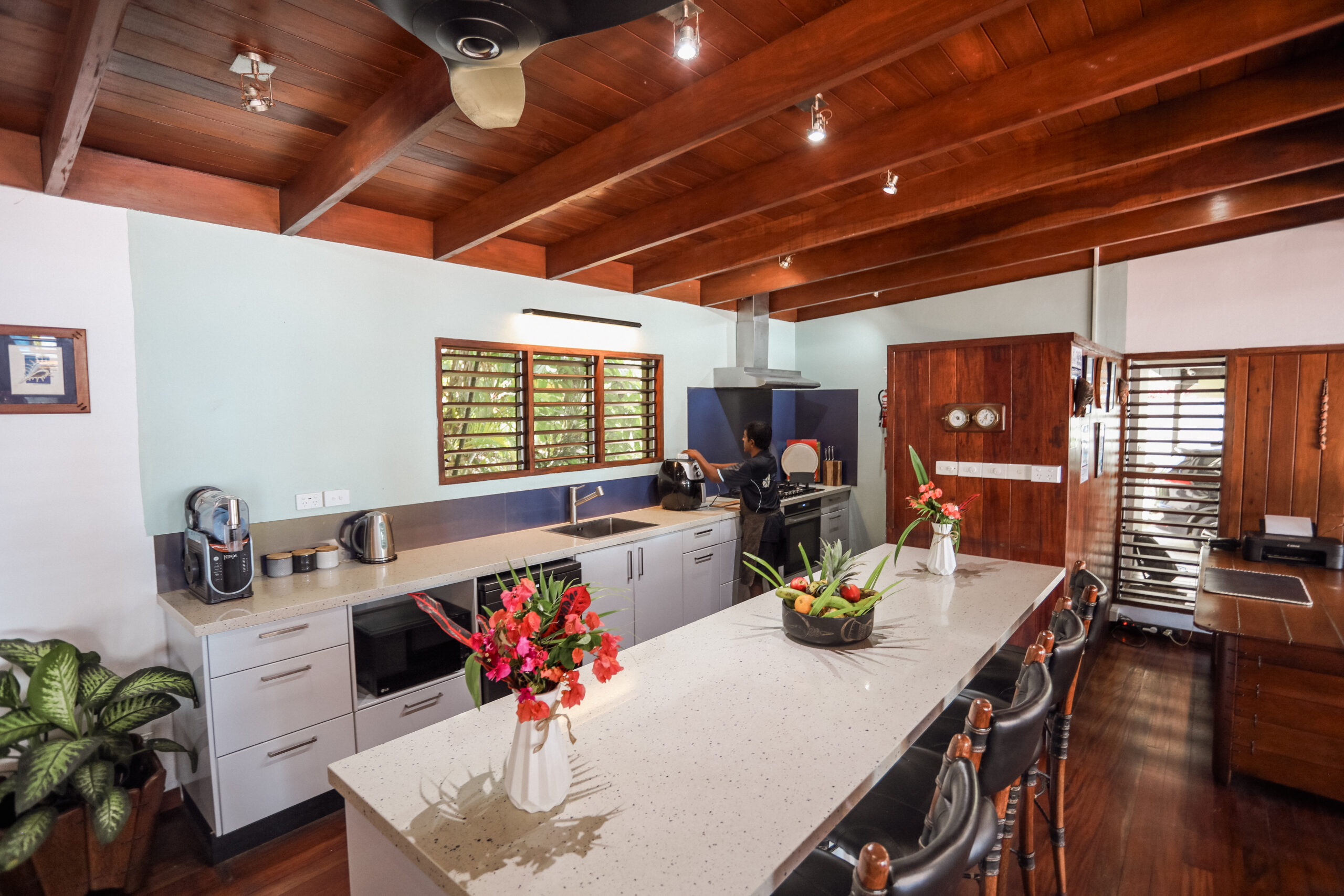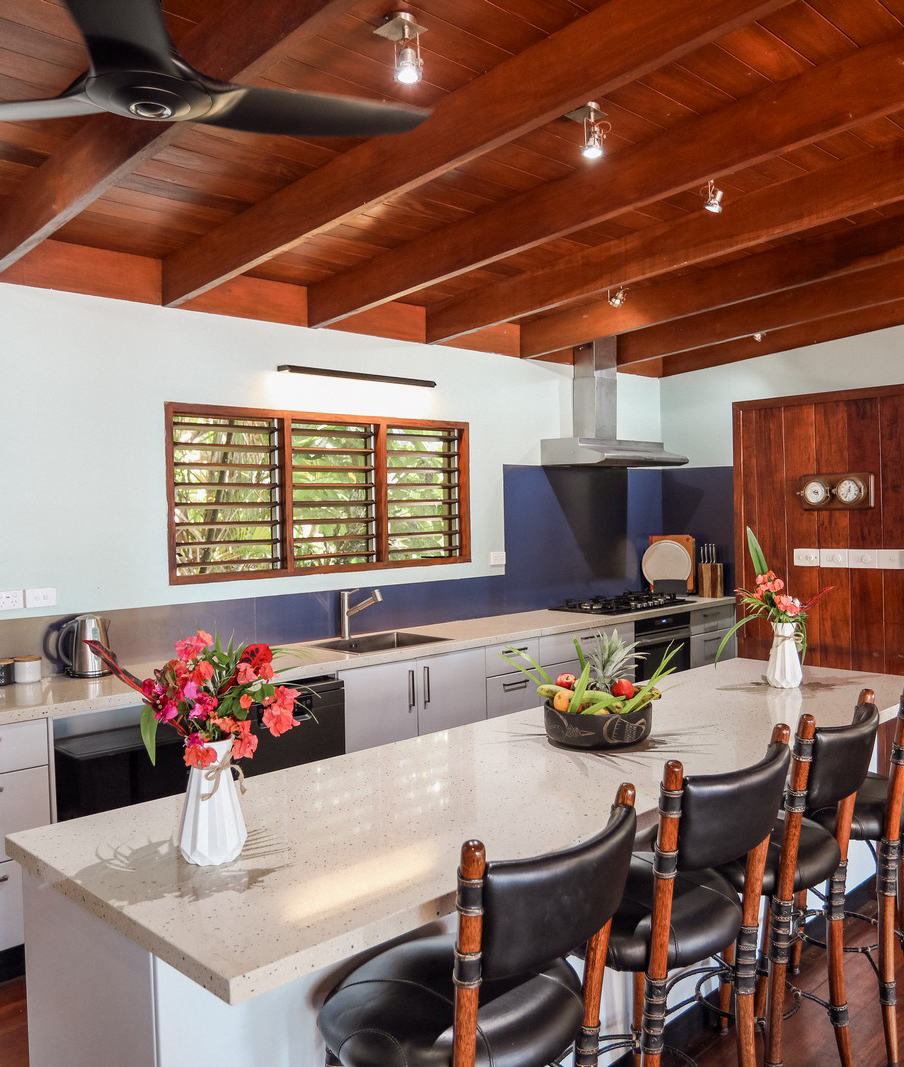 Recently renovated, the spacious open-plan kitchen features a large breakfast bar, modern appliances, and warm timber finishes that create a relaxed yet refined island feel.