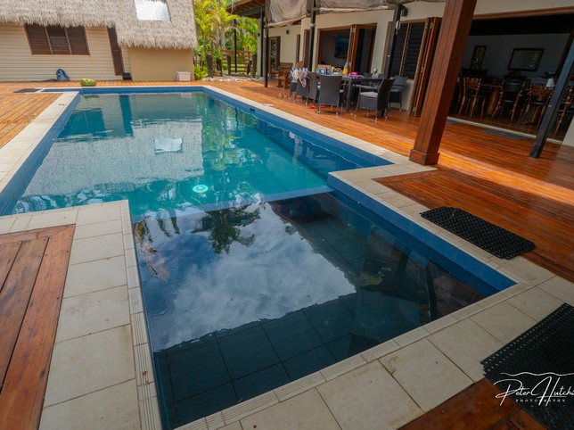 - Covered poolside shelter offering shade throughout the day